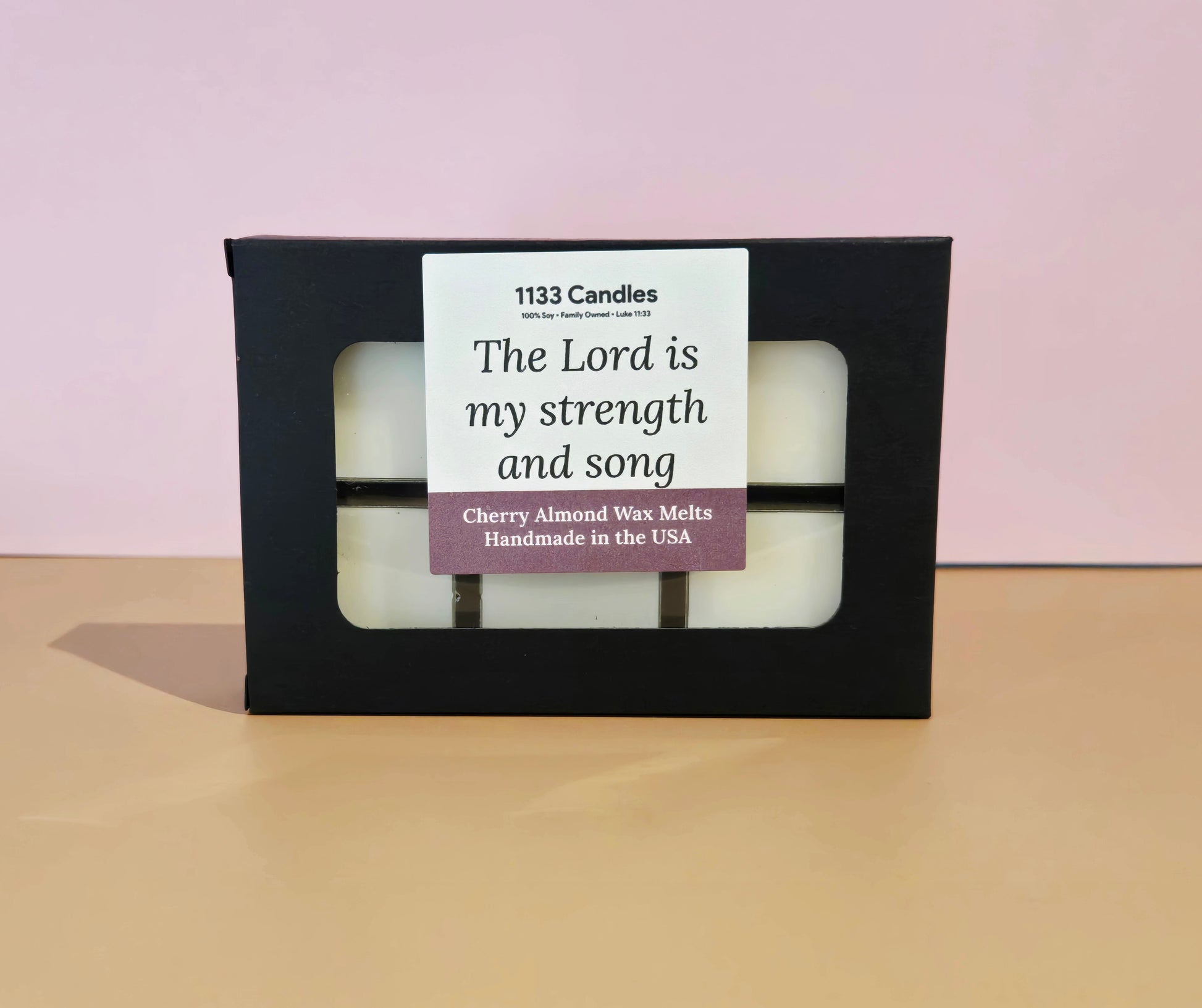 The Lord is my strength and song is the theme for our cherry almond wax melts! Inspired by the hymnal songs of praise, this bold fragrance binds the satisfying sweetness of ripe cherries and almonds. It smells just like the popular cherry almond lotion from back in the day. You'll enjoy these strong scented wax melts for yourself or an inspirational gift for a friend!