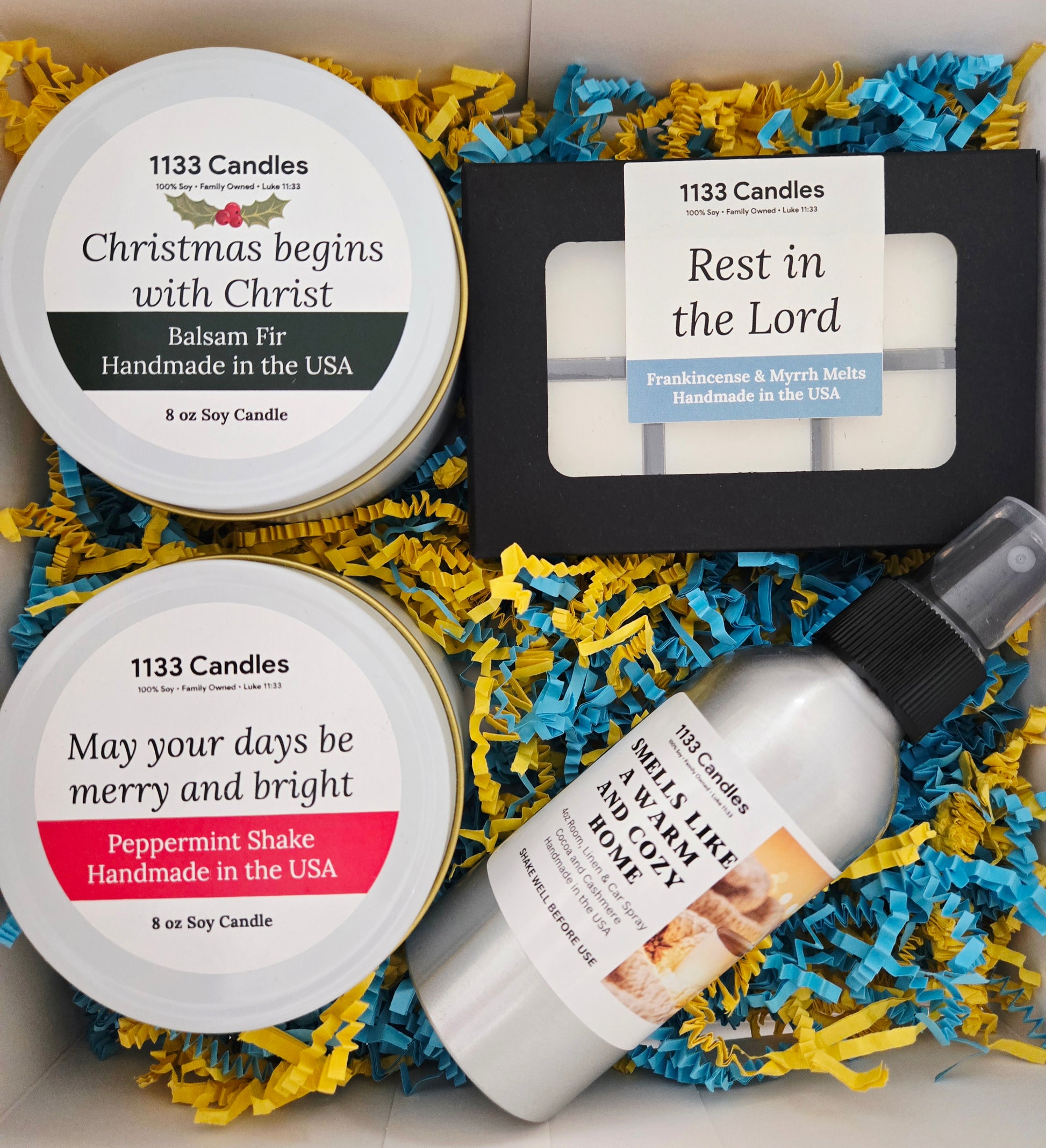 Christmas begins with Christ, He is the reason why we celebrate this holiday season! Let us adore Him and share His word with others this Christmas. Our unique gift set includes scripture-inspired candles with seasonal fragrances such as Balsam Fir and Peppermint Shake. As well as, frankincense and myrrh wax melts reminding you to "Rest in the Lord" and make your home smell warm and cozy with a Cocoa & Cashmere Room and Car Spray! Order this gift set for your family, friends, or yourself by the Christmas shipping deadline on December 15th.